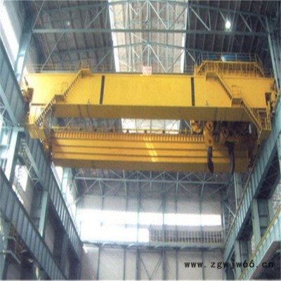 整台起重机是由桥架、小车(装有起升机构和运行机构)、起重及运行机构和电气设备四大部分组成。起升机构、小车运行机构和起重机运行机构是起重机的三个工作机构,各机构都备有单独的电动机,进行各自的驱动。起重量5、10吨的起重机为单钩起重机,仅有一套起升机构。16/3.2~50/10吨的起重机,则具有两个吊钩。因此有主副两套独立的起升机构,主钩是用来提升重的物件,副钩除可提升较轻的物件外,在它额定的负荷范围内也可用来协同主钩倾转或翻倒工件之用,但必须注意的是,不允许两个吊钩同时提升两个物件,两个吊钩一起工作时,物件的重量不许超过主钩额定起重量。