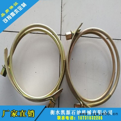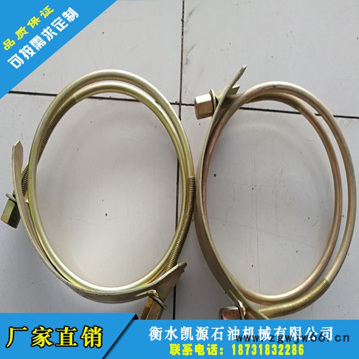 卡箍/管卡采用顶端弧形钢板,钢筋环绕两圈螺母紧固方式加紧,材质选用**碳钢,两圈环绕方式增加紧固时受力面积,双头选用**圆柱形钢螺母,此螺母使其大大弥补滑扣这一缺点,更加坚固耐用方便扳手紧固。调节范围比较大,一般按胶管的外径跟喉箍的内经来衡量,这种的喉箍一般按"寸"为单位,从而成为大口径胶管连接,机械管道连接不可缺少的配件。