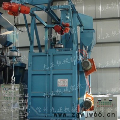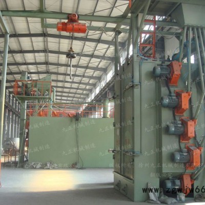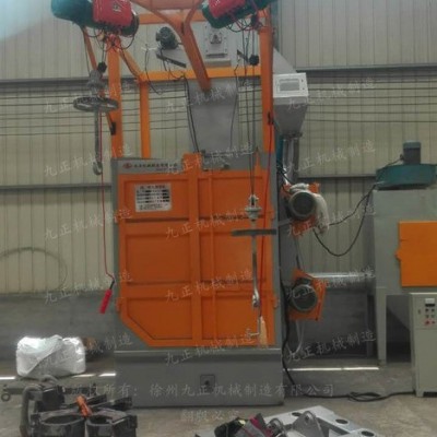 Q37系列吊钩式抛丸清理机,由抛丸清理室、提升机、分离器、螺旋输送器、抛丸器总成、吊钩及拖线系统、提升机平台、导轨及支架、吊钩自转减速装置、供丸系统、地基、除尘系统、电气控制部分等组成
