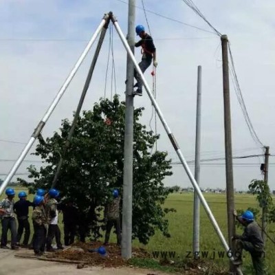 铝合金立杆机主要材质为铝镁合金铝合金管材,质量轻,承重能力强,搬运方便,操作简单,深受广大电力施工单位的好评。铝合金立杆机由三根杆组成,所以又被称为三脚立杆机或三角架立杆机、三角抱杆。铝合金立杆机可组立的线杆长度为:8米线杆用立杆机,10米线杆用立杆机,12米线杆用立杆机,15米线杆用立杆机。