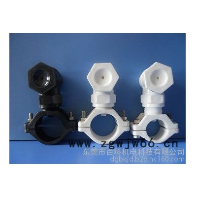 夹扣式喷嘴由夹扣底座(开孔Φ8-20mm)、可拆螺纹帽盖、可调球头三件组成,该类喷嘴底座有三孔位预留,此结构可以配合双夹扣和单夹扣调节管子外径不同时的夹紧度。