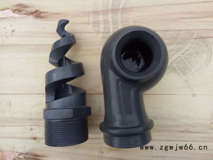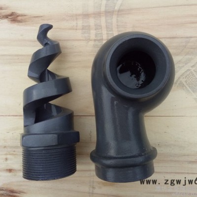 (1)双空心锥切线型喷嘴 设计两个喷孔,在脱硫塔内,一个喷嘴向上喷,一个喷嘴向下喷,或者向同一个方向喷淋,该喷嘴相对于单向空心喷嘴覆盖率高,一般安装于脱硫塔中心位置,能有效防止烟气逃逸。该种喷嘴允通过的颗粒尺寸为喷孔直径的80%~**,也可以设计为上下两个喷孔流量不同,如80%向上喷,20%向下喷。