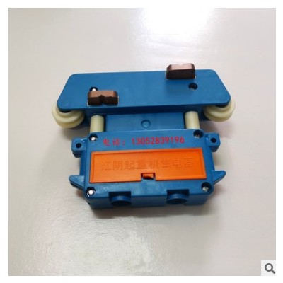 图片中集电器为四级,正面、背面分别有两个碳刷,适合于1-20吨单梁行车用。配套的滑触线为最常用的57(宽)x67(高)管子系列。每台行车上配套2只,避免起重机集电器碳刷磨损后导致的缺相运行。