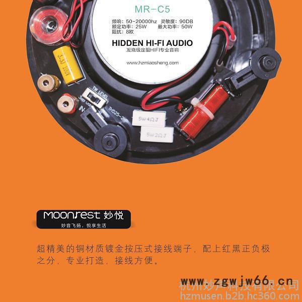 ????外观采用**高科技——无边框设计,吸顶安装更显高端简洁。无边框超薄金属网罩,高密度,经过特殊的环保烤漆工艺,手感平滑**不褪色、不生锈、不氧化、吸力**;???**元件±3dB分频器**控制扬声器的中、高、低音,音质甜美、悦耳;????橡胶边PP盆,25芯KSV音圈,全面旋转20芯丝膜高音头,音质清晰、细腻;????频宽为50Hz~20KHz,低频厚实、震感强;????2.25寸圆型塑料盆架,选用上等材质,开模精致低调;????超精美的铜材质镀金按压式接线端子,配上红黑正负极之分,专业打造,接线方便。Moonrest 妙悦 智能背景音乐系统 家庭背景音乐系统 204mm 温馨家庭背景音乐系统 智能背景音乐主机 杭州妙声科技 隐藏式音响 HIFI音响 无边框定阻音箱 无边框定阻喇叭